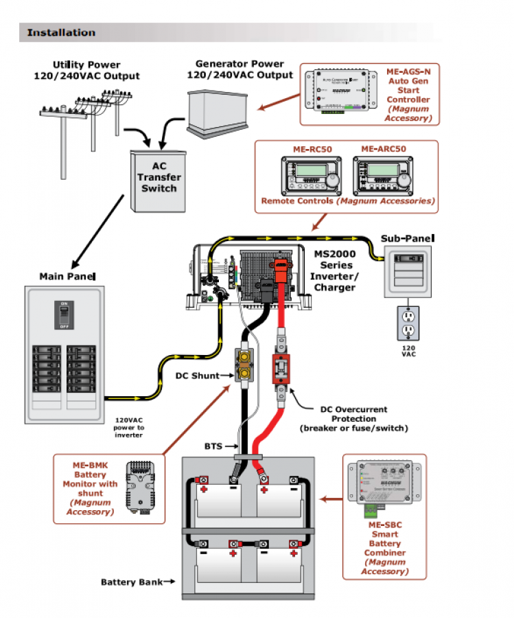 Magnum, MS4024 battery inverter, 4000W, 120VAC, 60Hz, 2x30A Transfer, 24VDC, Sinewave, Off Grid, 3 Yr Warr, 105A Charger, with BTS, MS4024